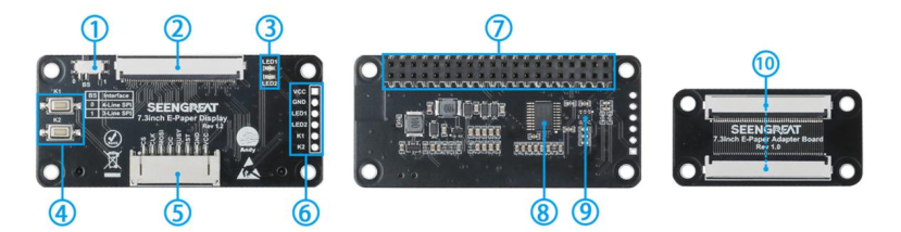 ①SPI选线开关 ②电子纸接口或FPC延长线连接器 ③两个用户 LED ④两个用户按钮 ⑤预留电子纸控制接口连接器 ⑥预留 LED 和按钮扩展引脚 ⑦Raspberry Pi 40PIN母头 ⑧电压转换器TXS0108EPWR ⑨电源芯片 ⑩电子纸接口转接板