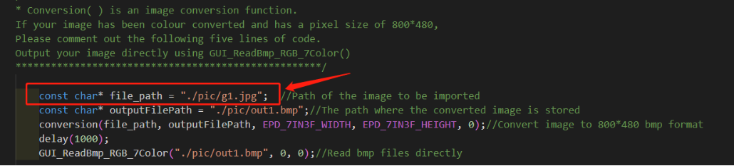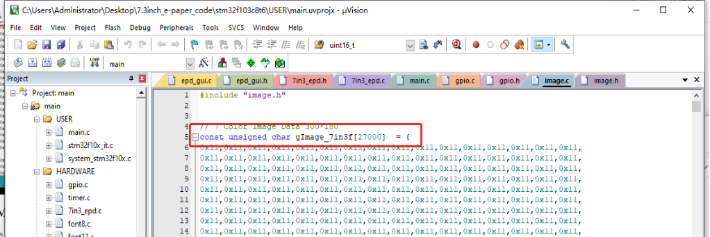 2.打开main.c程序,在main函数中找到输入的图片文件路径,将其更改为您的图片文件名,然后保存。