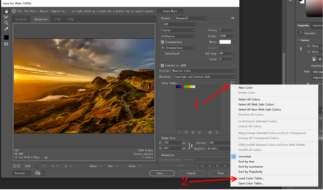 4. 如图4-10中红色箭头所示,依次点击1和2,选择“加载颜色表”,然后加载颜色表文件N-color.act。颜色表文件位于用户的压缩包中。