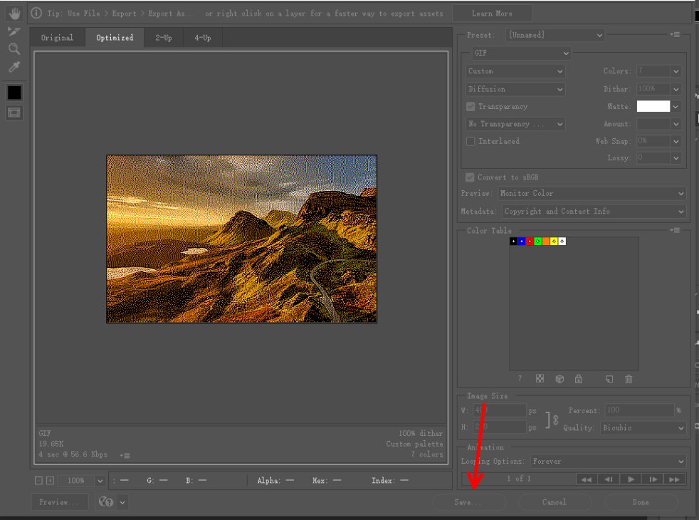 5.加载色表后,如图4-12所示,点击“保存...”红色箭头指示,将其另存为 GIF 文件。