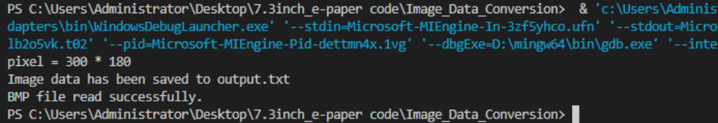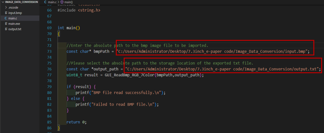 1.使用 Visual Studio Code(GCC 编译器和环境设置需要独立完成)打开“Image_Data_Conversion”文件夹。将主函数中的图像路径更改为上一步处理的导入的 BMP 格式文件。