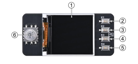 ①1.44英寸液晶显示屏 ②用户按钮K1 ③用户按钮K2