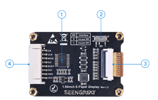 ① TXS0108 级别转换芯片② SPI 线路选择开关③ 电子墨水显示连接器④ SPI 控制接口连接器