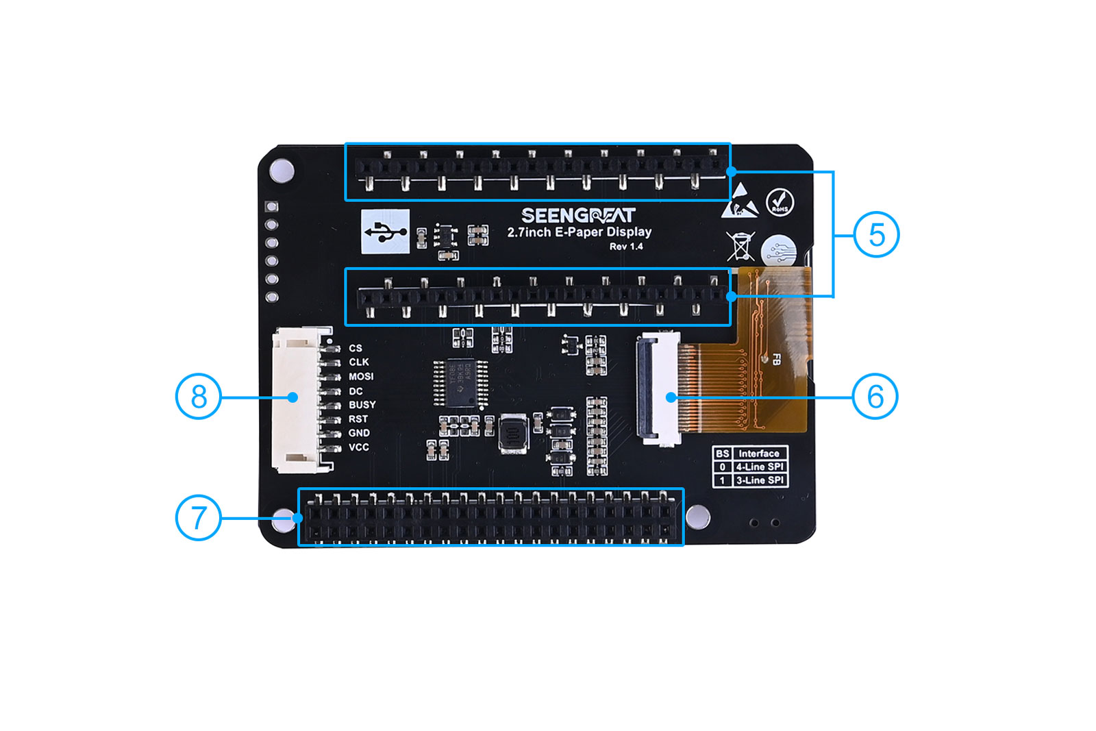 ⑥E-Ink 显示连接器⑦Raspberry Pi 40PIN 接头⑧预留 SPI 接头