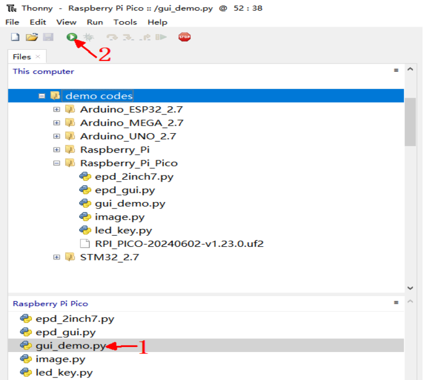 5. 双击 Raspberry Pi Pico 窗口中的gui_demo.py(见图 4-2 中的 1),然后单击“双击树莓派Pico窗口中的gui_demo.py(见图4-2中的1),然后点击“Run current script (F5)”