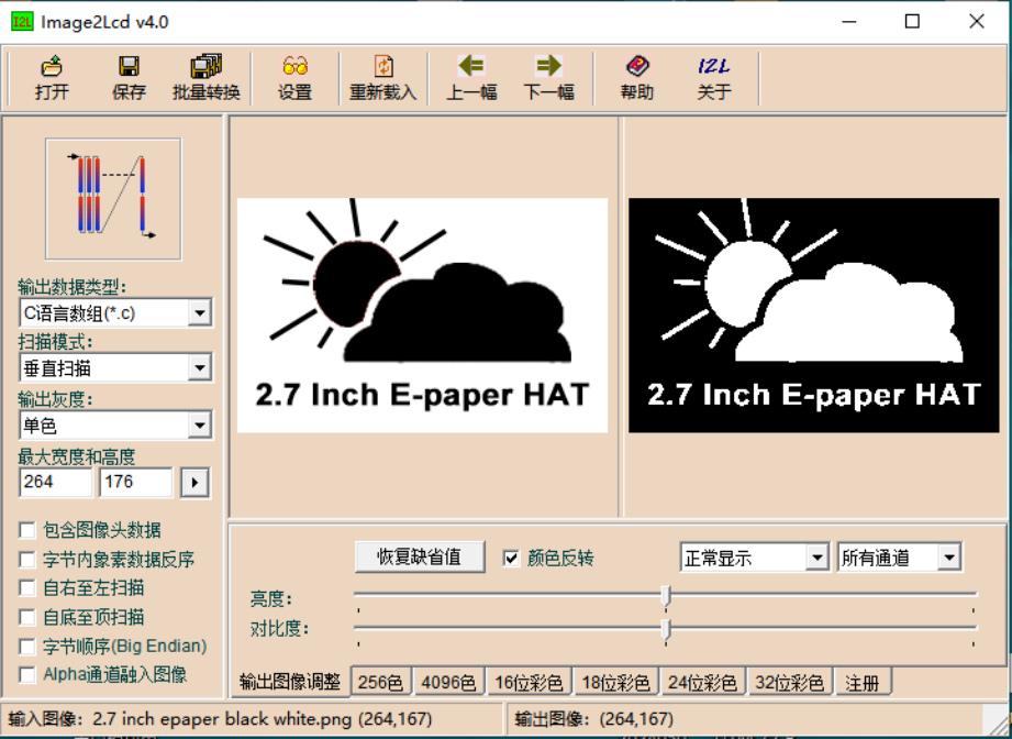 创建要显示为分辨率为 264 x 176(不支持灰度)的纯黑白图像的图像。将它们保存为 BMP 或 JPG 文件(建议使用 BMP 格式)。