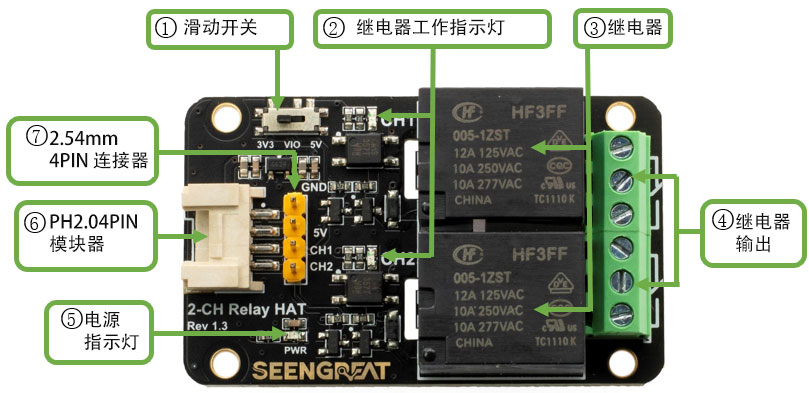 ①继电器控制信号电平和幅度滑动开关,提供3.3V或5V。②继电器工作指示灯:当灯亮时,表示继电器常开端闭合,常闭端断开,当灯熄灭时,表示继电器常开端断开,常闭端闭合。③ 继电器 ④继电器输出 ⑤ 电源指示灯 ⑥PH2.0 4PIN 模块线 ⑦2.54mm 4PIN 继电器