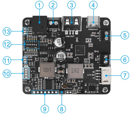 5. 太阳能和 USB 连接的充电行为:当太阳能和 USB 接口都在充电时,来自太阳能接口的充电电流将断开,DONE 灯将亮起,CHRG 灯将关闭。该板将优先考虑 USB 充电。