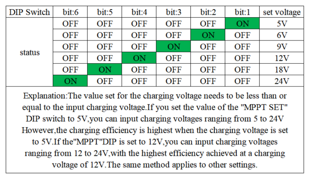 1.“MPPT SET”DIP开关设置:使用太阳能电池板为电池充电时,请确保“MPPT SET”DIP开关配置正确。DIP 开关的只有一个位置应设置为“ON”,所有其他位置应设置为“OFF”。音量tage 由“MPPT SET”DIP开关设置应基于太阳能电池板的规格。太阳能电池板的开路输出电压越接近MPPT设定电压,充电效率越高。但是,太阳能电池板的输出电压必须大于或等于 MPPT 设定的电压。充电电压设置如下图所示: