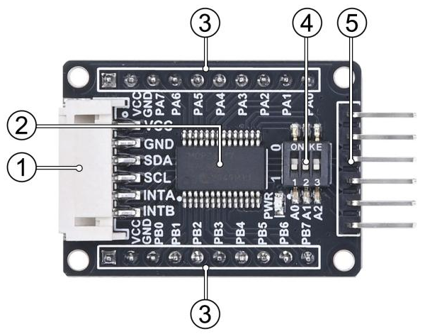该模块的示例程序将 PA 端口 (PA0-PA7) 设置为输出,并以 1 秒的间隔在高电平和低电平之间循环切换。PB端口(PB0-PB7)设置为输入,当任意PB端口引脚的电平发生变化时,通过INTB引脚产生中断。此时,读取PB端口的电平。