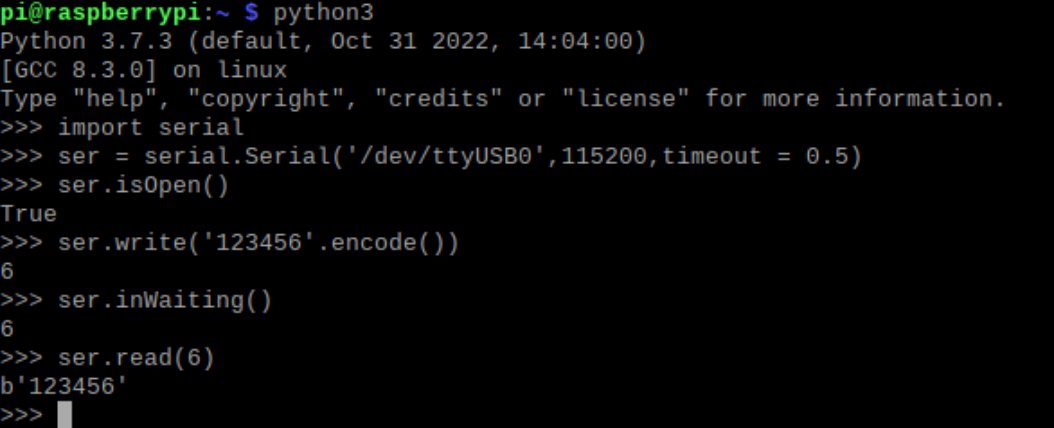 pi@raspberrypi:~ $ python3 # open editable interface Python 3.7.3 (default, Oct 31 2022, 14:04:00) [GCC 8.3.0] on linux Type "help", "copyright", "credits" or "license" for more information. >>> import serial # import the module >>> ser = serial.Serial('/dev/ttyUSB0',115200,timeout = 0.5) #Set parameters: serial port number, baud rate, read time >>> ser.isOpen() # determine whether the serial port is open True # serial port is open return True, otherwise return False >>> ser.write('123456'.encode()) # input data, data can be input multiple times 6# read returns the number of bytes written >>> ser.inWaiting() #Read the total input bytes 6# return, display the accumulated number of bytes >>> ser.read(6) #read six bytes, assuming a total of 24 bits of data are input, this time the first six bits will be output; if changed to ser.read(24) then only the input 24 bits will be output data b'123456' >>> |