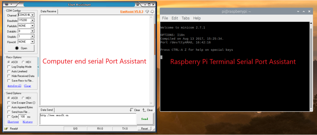 接下来,在您的计算机上,打开串行调试工具。确保两端串口参数设置相同。