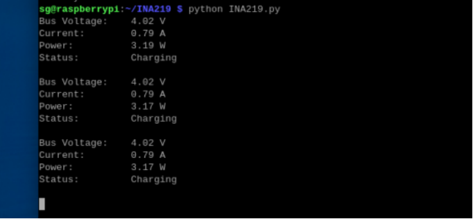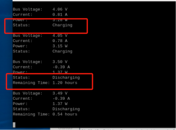 窗口会打印出当前的电池电压、电流、功率、充放电状态以及非充电状态下电池的续航时长,电流显示正数时表示接入USB给电池充电或使用,当电流显示负数时,表示电池放电