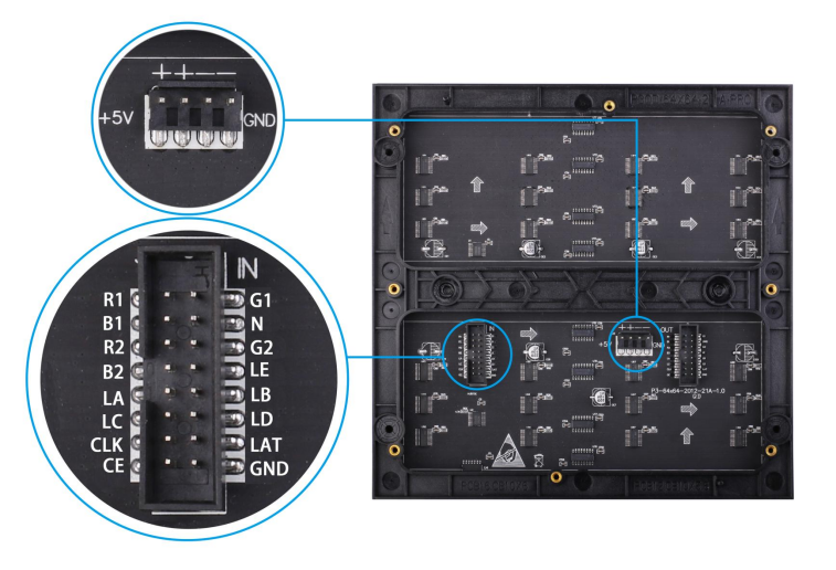 ● 板载两个 HUB75 接口,分别用于输入与输出,可实现多屏级联