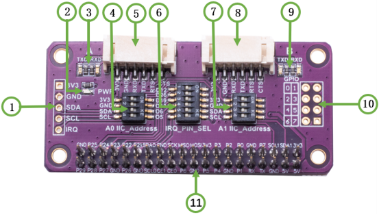 基于树莓派40P接口排针设计,适用于Raspberry Pi Zero/Zero W/Zero WH/2B/3B/3B+/4B,采用SC16IS752芯片方案,可以同时扩展两路串口和8个GPIO。I2C地址的设置和中断引脚的选择均采用跳线帽设计,用户使用方便。